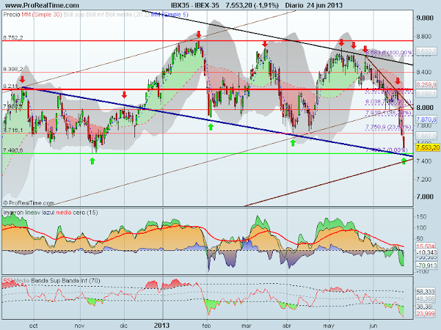 El Ibex ha caído, porcentualmente, más que ningún índice, fruto de la volatilidad de nuestro mercado. Si recuerdan traemos un objetivo desde hace varios meses, la zona 7.490 puntos que prácticamente hemos pinchado en la sesión, por lo que ahora toca rebote, al menos hacia los 7.910 puntos, fibo 38,2% de la actual caída.