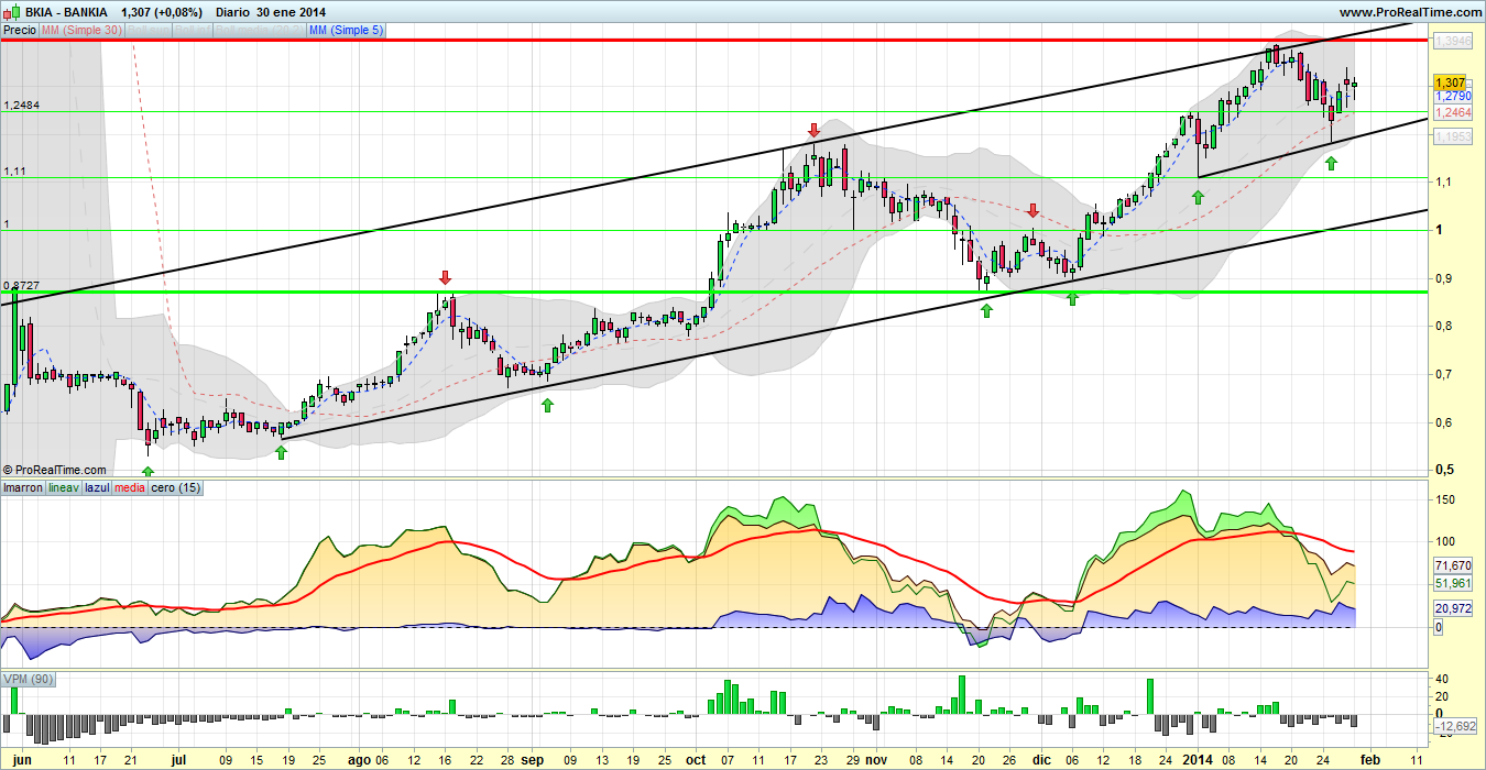 Les quiero recordar un gráfico en velas mensuales, de largo plazo, del SP500, que ya hemos mostrado en el blog y que puede avalar lo que está sucediendo. Los últimos 30 años, el SP500 dibuja un canal creciente en el que el precio acaba de tocar la parte alta. ¿Fin del mercado alcista? No, ni mucho menos, el mercado es creciente de fondo, pero ha llegado el momento de un alto en el camino para bajar a apoyar a niveles inferiores de precio. Lo natural dentro de este movimiento es que el precio visite la zona de apoyo 1.530 - 1.580 antes de un segundo intento de superación del canal actual. Fíjense que hablamos de velas mensuales, por lo que este movimiento puede tener fácil, 2014 - 2015 como duración.